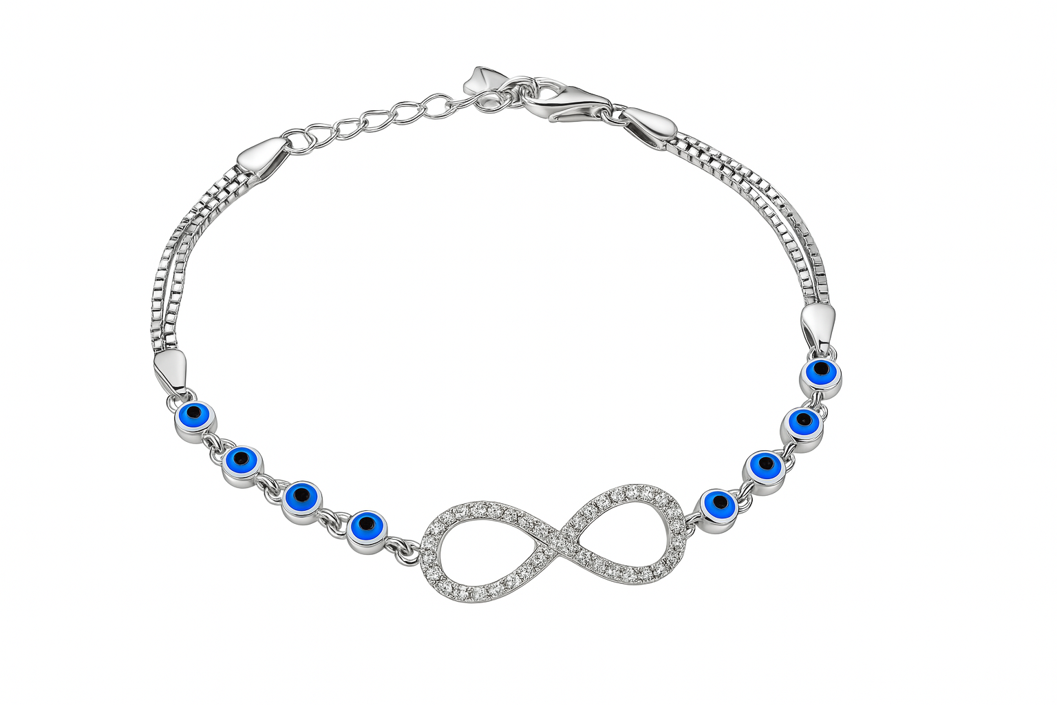 A Striking blend of elegance and symbolism, this bracelet features an infinity charm studded with premium-grade CZ stones, representing eternal strength and connection. Flanked by protective Evil Eye motifs in vivid blue, it’s designed to ward off negativity while enhancing your everyday style. Made from 925 sterling silver with platinum plating, it offers a luxurious finish, durability, and hypoallergenic comfort.