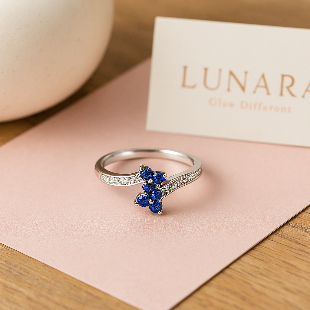 Discover the charm of the Veyona Ring, crafted in pure 925 sterling silver and adorned with deep blue gemstones that shine like the night sky. Its unique crossover band, set with delicate white stones, adds a modern yet timeless elegance to your style.